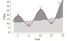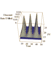 Ground lease escalations usually restrain rent below the market as they track the major tenant lease. Because market forces operate independent of these contractual relations, at times the major tenant lease is a burden and at other times it is a benefit. The developer's option position is at various times "in the money" as discount rates change. This position appears above the flat plane in the graphic above.