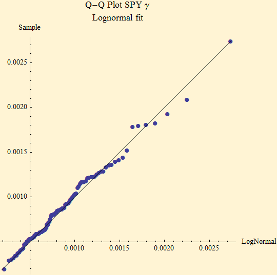 The Q-Q plot is shown. The lognormal fit was quite good until the current weeks, when the divergence of the tail began with the current high volatility. We are likely in a new era of volatility which will persist for some time. The intra-day scale factor may not be sufficiently constrained to fit to a model such as a lognormally scaled stable distribution.