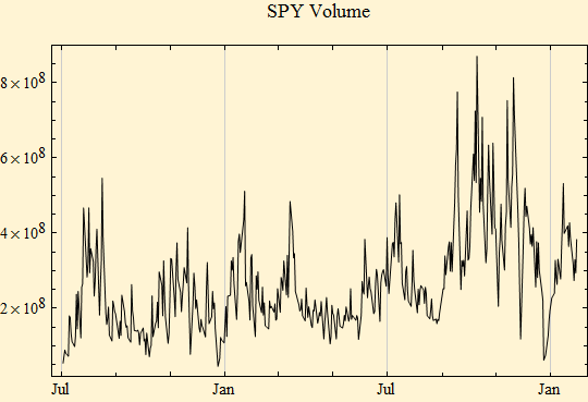 The pattern of volatility is related to market volume, but they are not directly proportional . The following plot shows the daily volume over the same time interval as the sample.